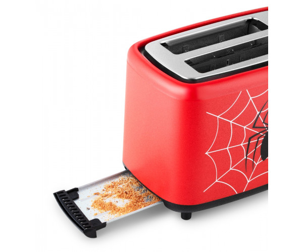 La Tostadora Spider-Man no solo es práctica, sino que también te facilita la vida. Su bandeja recolectora de migas te ayuda a mantener todo impecable y su base antideslizante asegura estabilidad total.